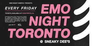 Emo Night Toronto at Sneaky Dee’s on March 11, 2022 Mar 10, 2022 By Admin Date and Time: March 11, 2022, 10:30 PM – 2:00 AM EST Day: Friday Organized By: EMO NIGHT NORTH Venue: Sneaky Dee's, ...