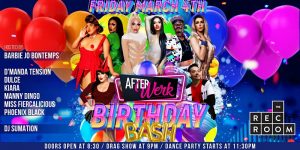 After Werk Birthday Bash Drag and Dance Party (Tier 2) on March 4, 2022 Feb 28, 2022 By Admin Date and Time: 4 Mar 2022, 9:00 PM – 2:00 AM EST Day: Friday Organized By: After Werk Events Venue: The Rec ...